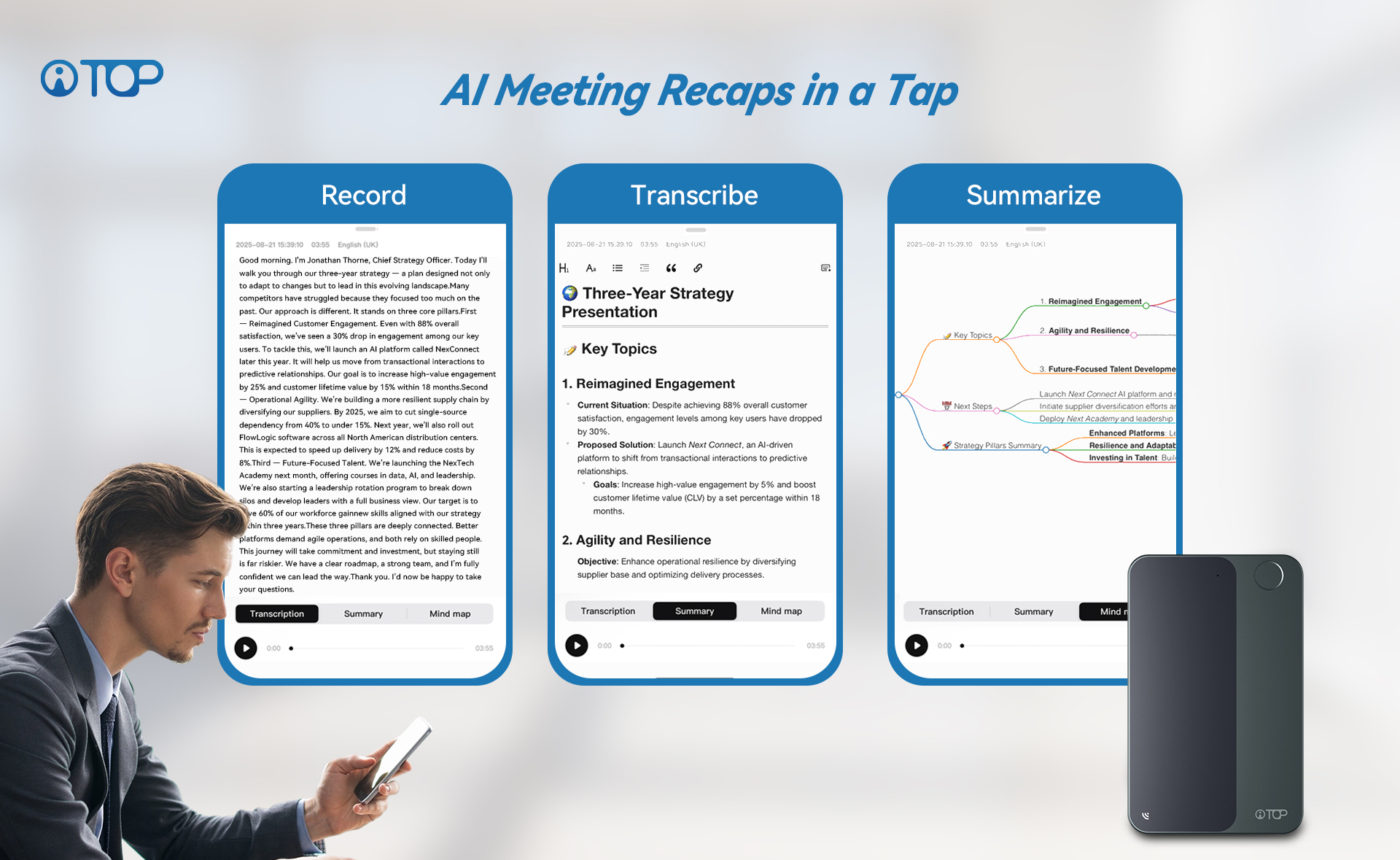Automatically records, transcribes and summarizes meetings. Export as text documents or visual mind maps.